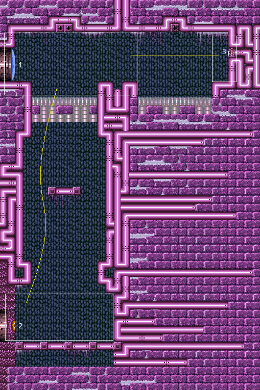 Enter with G-mode direct, back up to between 1 and 6 pixels from the door transition, and activate X-ray to get very deep stuck in the door. Climb up 2 screens, and perform a turnaround buffered spin-jump away from the door to trigger the transition, bypassing any lock on the door. Entrance condition: {